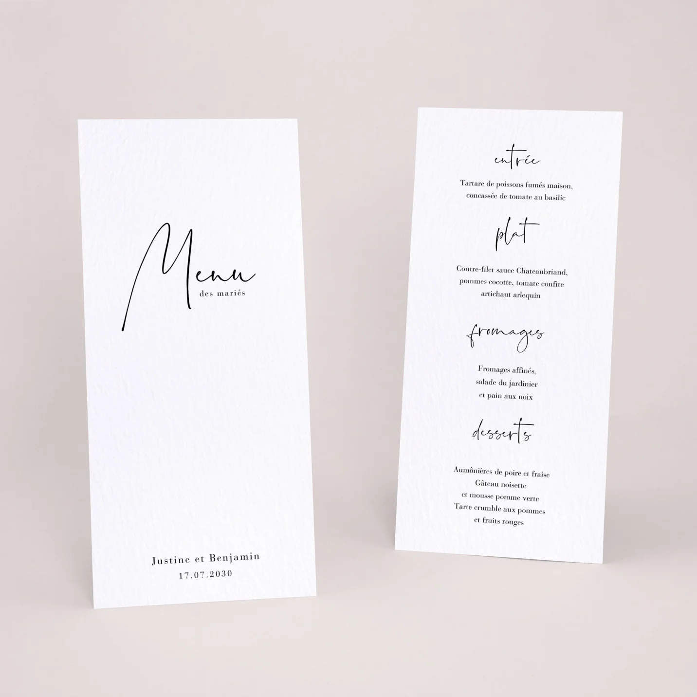 Nos menus de mariage sont pensés comme un véritable élément de décoration de table. Personnalisés selon votre thème, ils s’intègrent harmonieusement à votre scénographie et valorisent l’expérience de vos invités lors de la réception.
